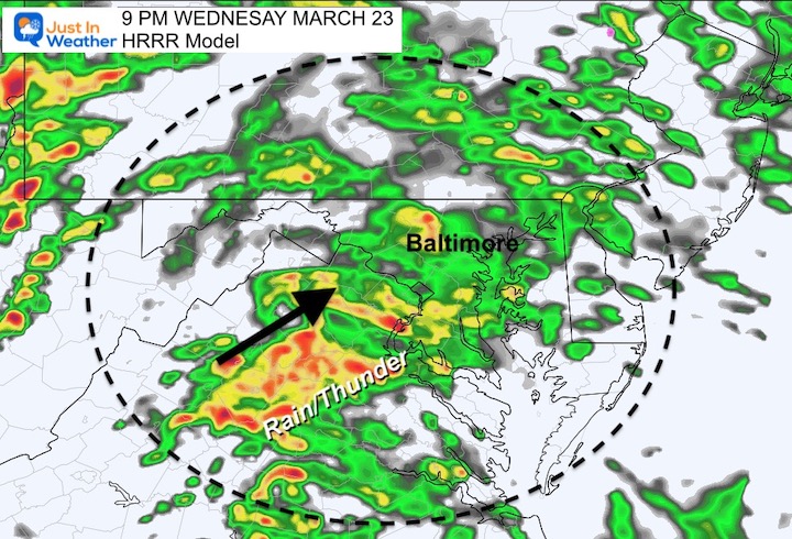 While the main risk of severe weather should remain to our south, some thunderstorms could move into central Maryland tonight. Then a better chance around the Bay and Delmarva tomorrow. I will have a full update later today.