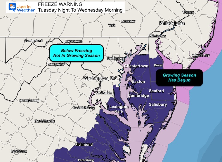 This includes Southern Maryland and Delmarva, where the growing season has begun. Although widespread temperatures below freezing will occur inland, the growing season has not been considered in progress there yet.
