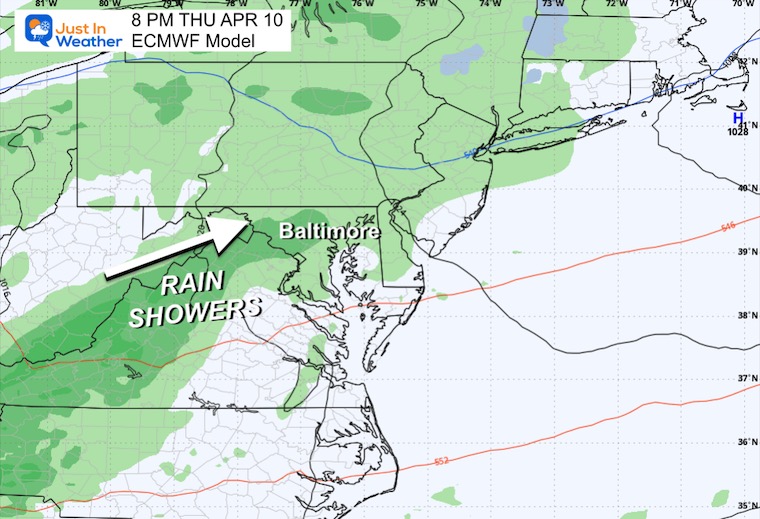 Chilly rain showers with snow falling in the Western Maryland mountains, Poconos, and into New York and New England.