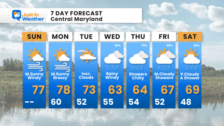 Pleasant weather while still with a breeze on Monday. Then the next storm will arrive with a chilly pattern in the jet stream mid week. This will bring us a steady rain on Wednesday, then lingering showers and temperatures more like March or April for the rest of the week.  This may limit any severe risk, but keep an eye on swollen waterways.
