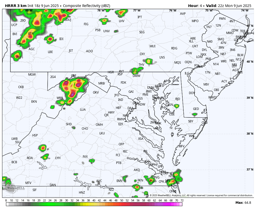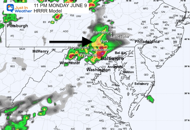 These storms will lose some punch but remain strong as they pass across North Central Maryland and Southern Pennsylvania between 10 PM and 2 AM. See the timeline below.