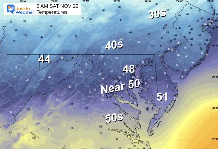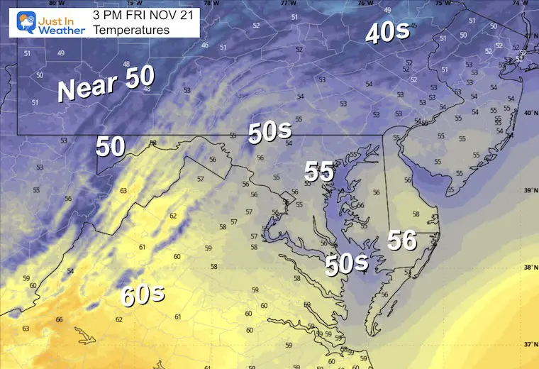 Sunday looks good for the Ravens’ home game, then the next rain will actually arrive earlier. Speeding this up means Tuesday looks wetter, with rain showers on Wednesday AND the arrival of colder air during Thanksgiving Day into Friday.
